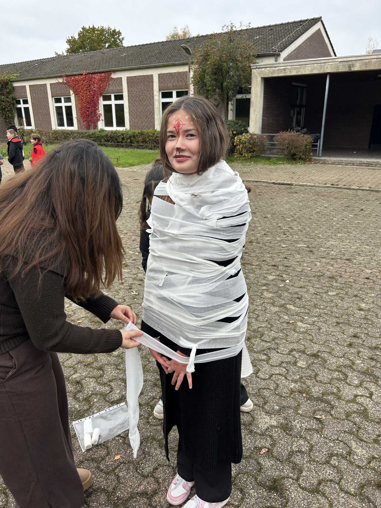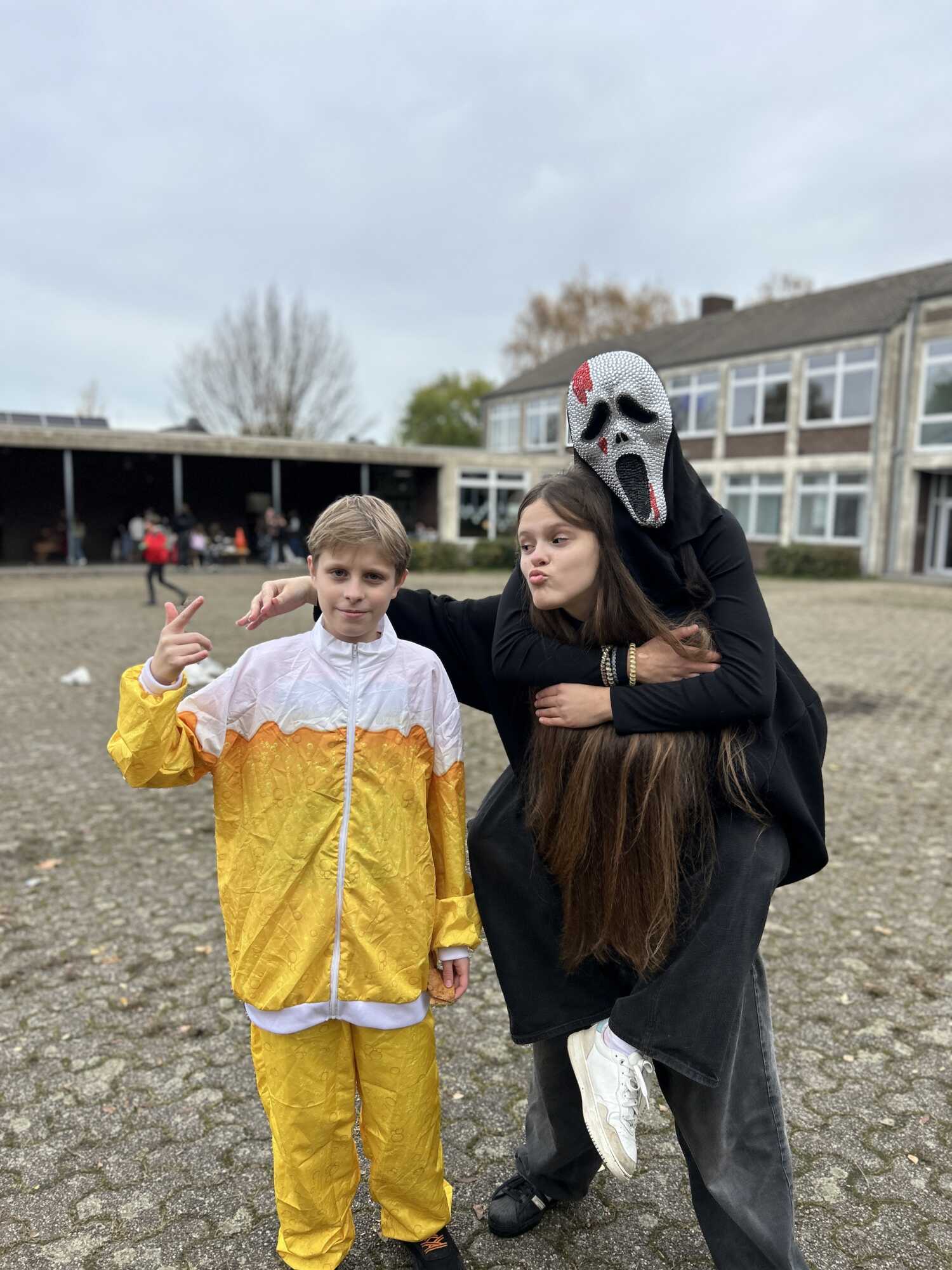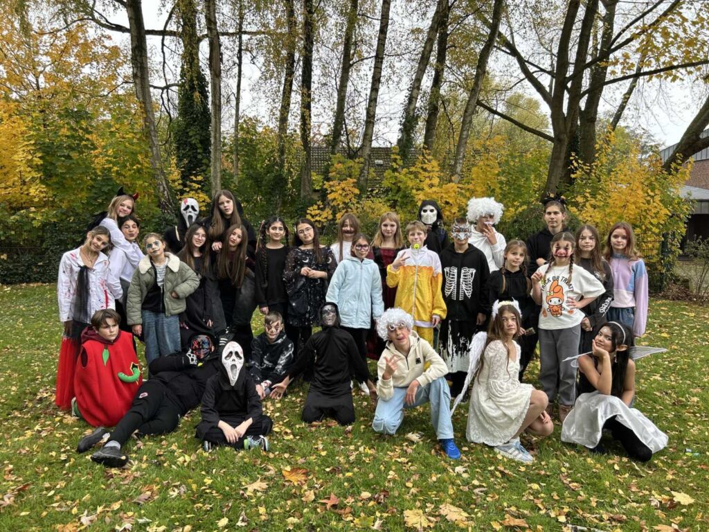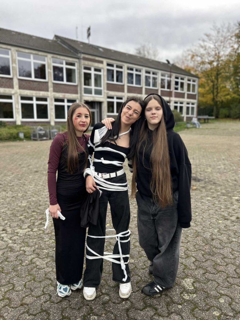 Schon beim Betreten des Schulhofs spürte man: Heute war kein ganz gewöhnlicher Schultag. Die gruseligen Kostüme der Schüler*innen brachten gleich zu Schulstart eine besondere Atmosphäre in die Schule. Nach dem Unterricht wurde sich dann gemeinsam vorbereitet: ein letztes Mal in die Maske, damit das Kostüm perfekt präsentiert wird, die Tanzschritte der Zombies noch ein letztes Mal im Kopf durchgehen und dann Musik ab für unsere Halloweenfeier auf dem Schulhof.