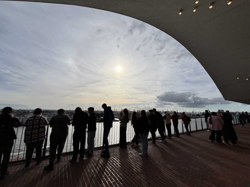 Nachdem alle Zimmer im Hostel bezogen waren, ging es für einen ersten Eindruck Hamburgs zur Elbphilharmonie. Von der Aussichtsplattform aus genoss die Stufe einen beeindruckenden Blick über den Hamburger Hafen und die Skyline der Stadt. Besonders der strahlende Sonnenschein, der uns die Woche über begleitete, betonte die schöne Aussicht.