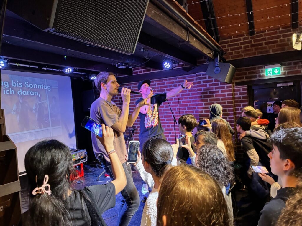 Die Songs der Band werden regelmäßig im DaZ-Unterricht der Vorbereitungsklassen eingesetzt. Entsprechend textsicher präsentierten sich die Schüler*innen beim Konzert und sangen die Lieder „Hobbys“, „Was zieh ich an?“ und „Alle Farben“ begeistert und lautstark mit.