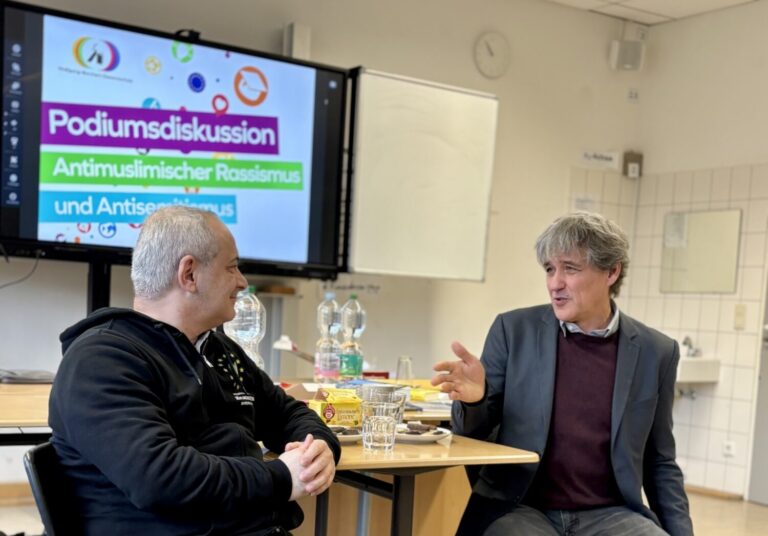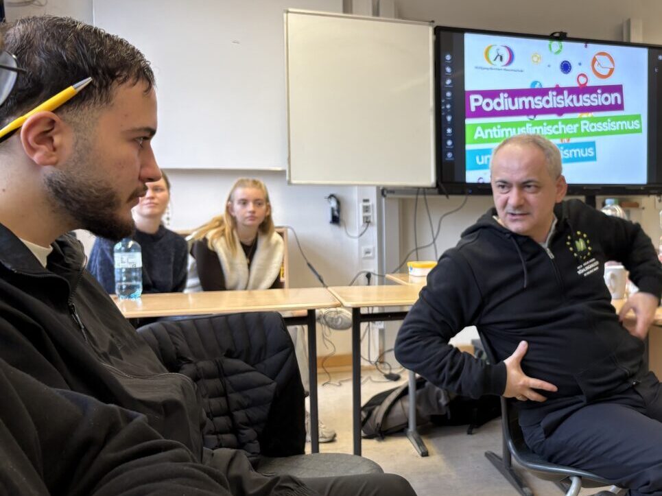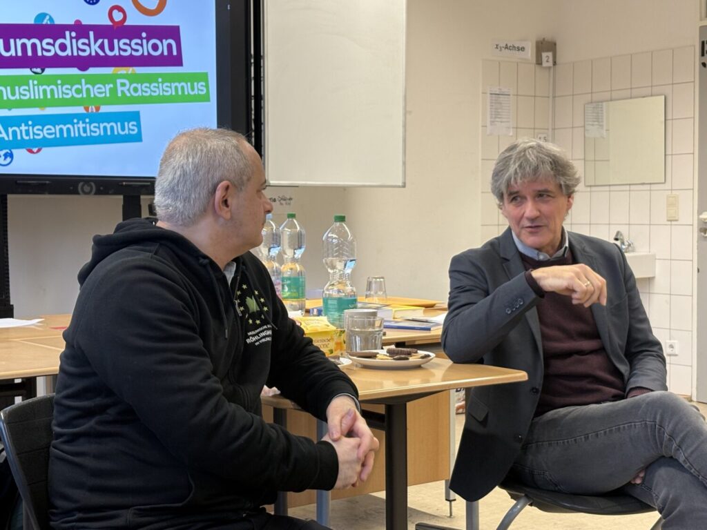 Zur Diskussion eingeladen wurden Herr Vogel und Herr Nazik. Herr Vogel hat als Mitarbeiter des Aktuellen Forums viel Erfahrung mit dem Thema Rassismus durch langjährige Arbeit in der politischen Bildung, seiner Begleitung von Fahrten zu Gedenkstätten und der Übersetzung von relevanten Fachtexten von Englisch zu Deutsch. Herr Nazik ist Imam in Herne-Röhlinghausen und war bereits Teilnehmer an unserem interreligiösen Dialog im April 2025. So konnte er die islamische Perspektive fundiert verdeutlichen.