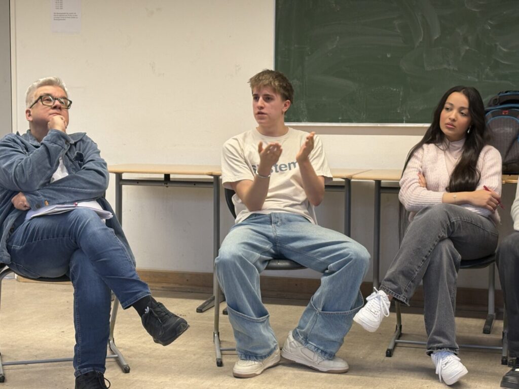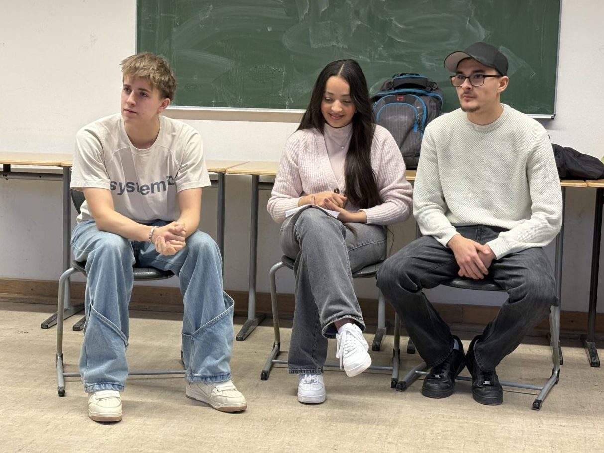 Die Stufenmitglieder Phillip, Sdra und Ersan übernahmen die kompetente Moderation der Diskussion und haben sichergestellt, dass alle Fragen der Schüler*innen, welche am Vortag gesammelt und strukturiert wurden, beantwortet wurden. Nach einer kurzen Einleitung von Herrn Dambeck begann die Podiumsdiskussion.